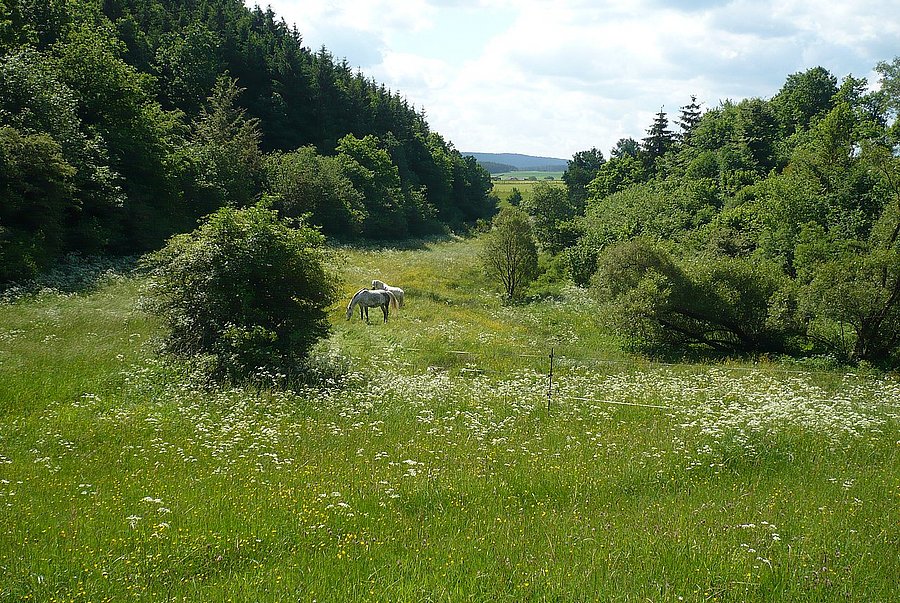 - Auf bestehenden artenreichen Grünlandflächen soll die pferdebezogene Nutzung (ggf.) optimiert werden. Die Erfolgsfaktoren sollen herausgearbeitet und auf weniger artenreichen Flächen zur Anwendung gebracht werden. Wo artenreiches Grünland (u. a. FFH-Grünland) aus der Nutzung zu fallen droht, soll dieses beispielhaft durch die Erzeugung von Pferdeheu sowie durch die Entwicklung von an die Vegetation angepassten Beweidungssystemen erhalten bzw. entwickelt werden.